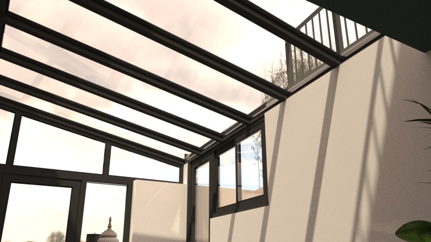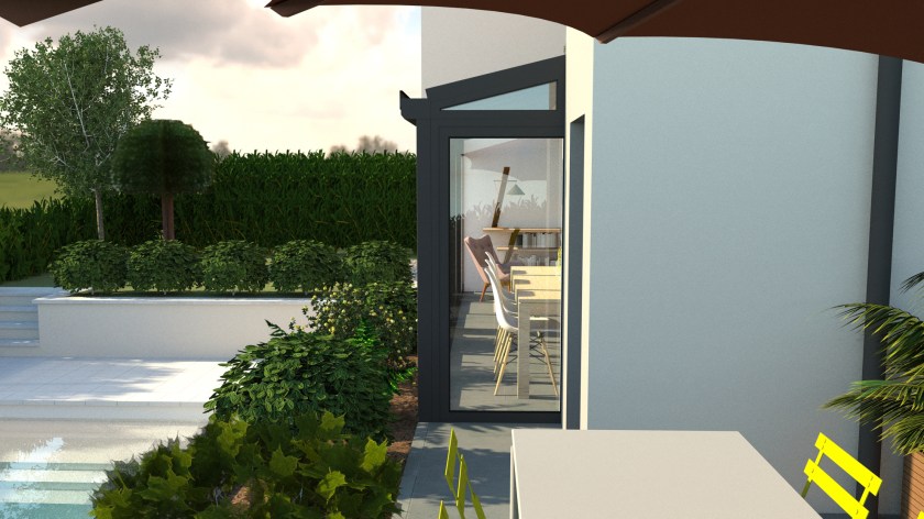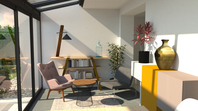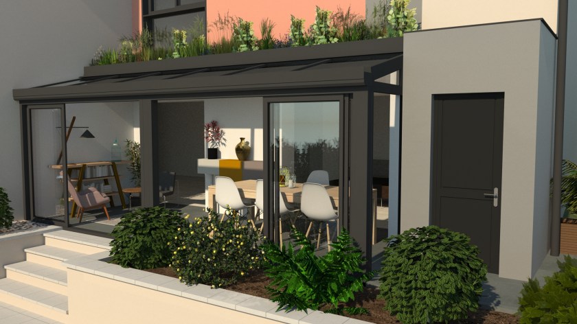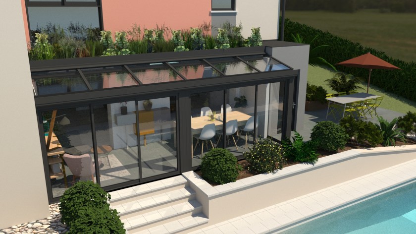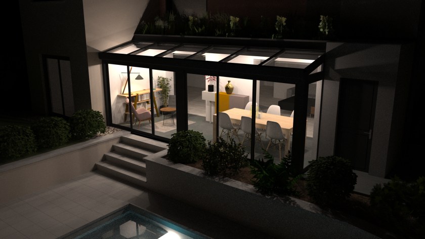 Extension toiture plate et verrière pour la création d’une salle à manger et d’un espace de lecture.