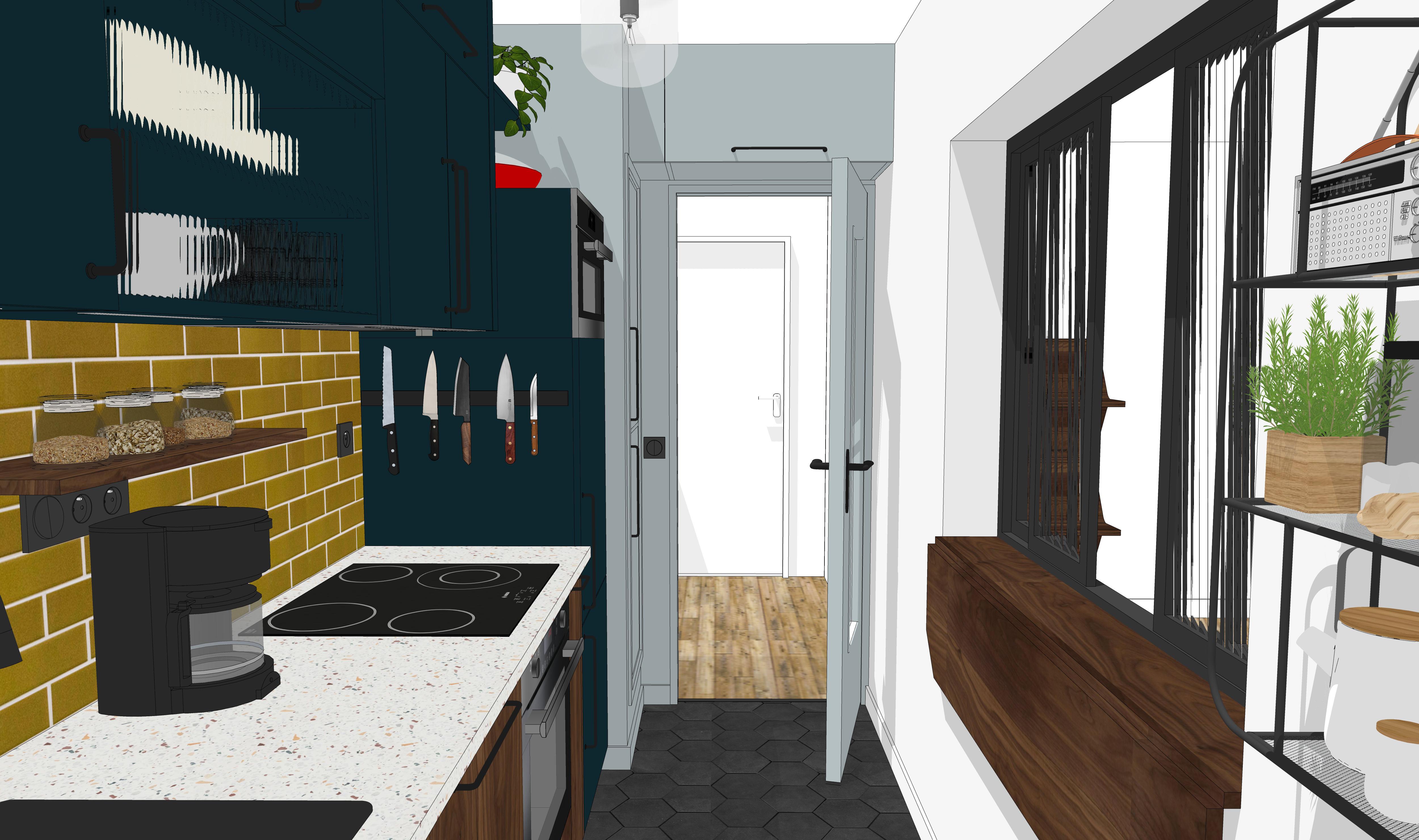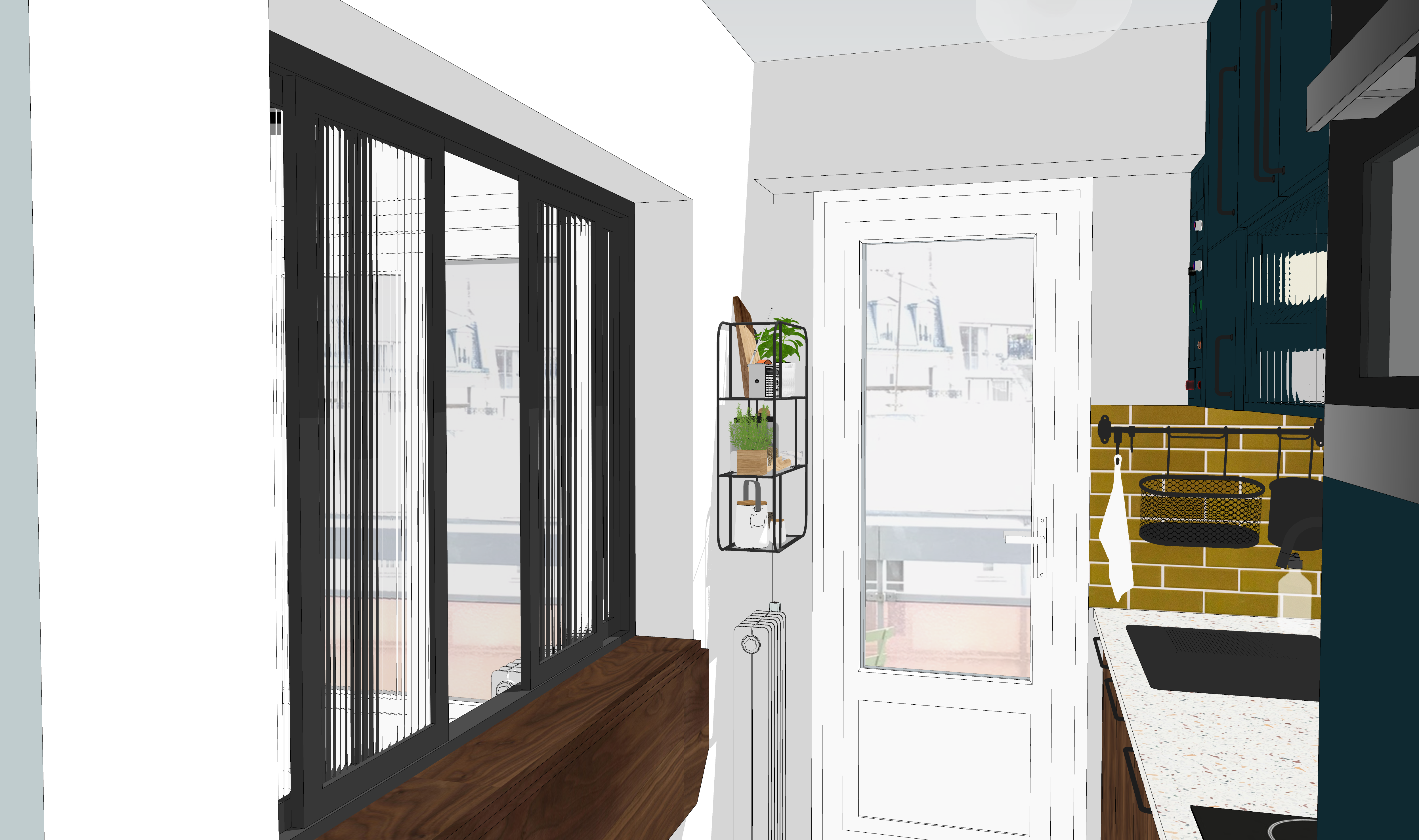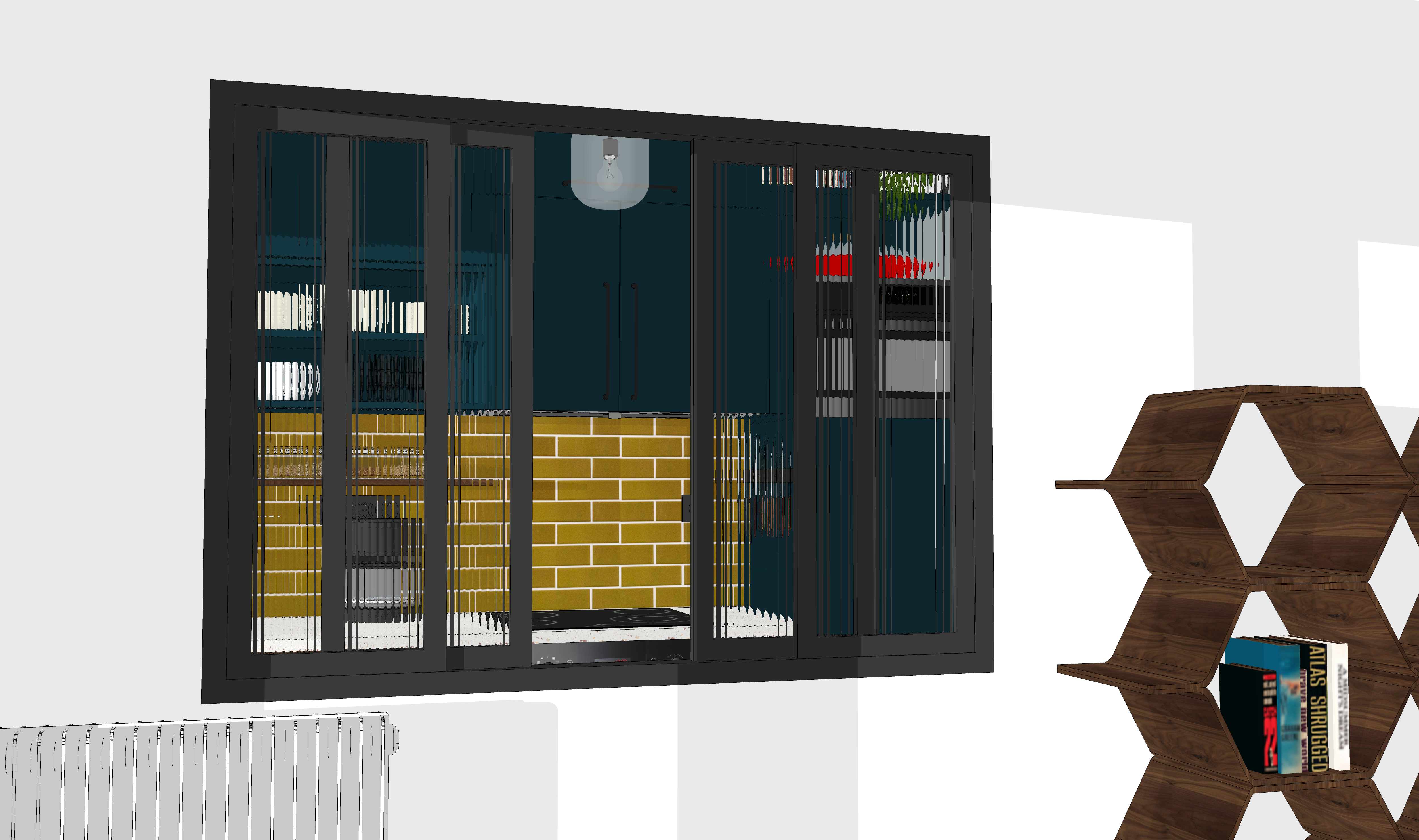 Création d’une verrière coulissante avec vitres en verre cannelé et d’une tablette amovible mange-debout.